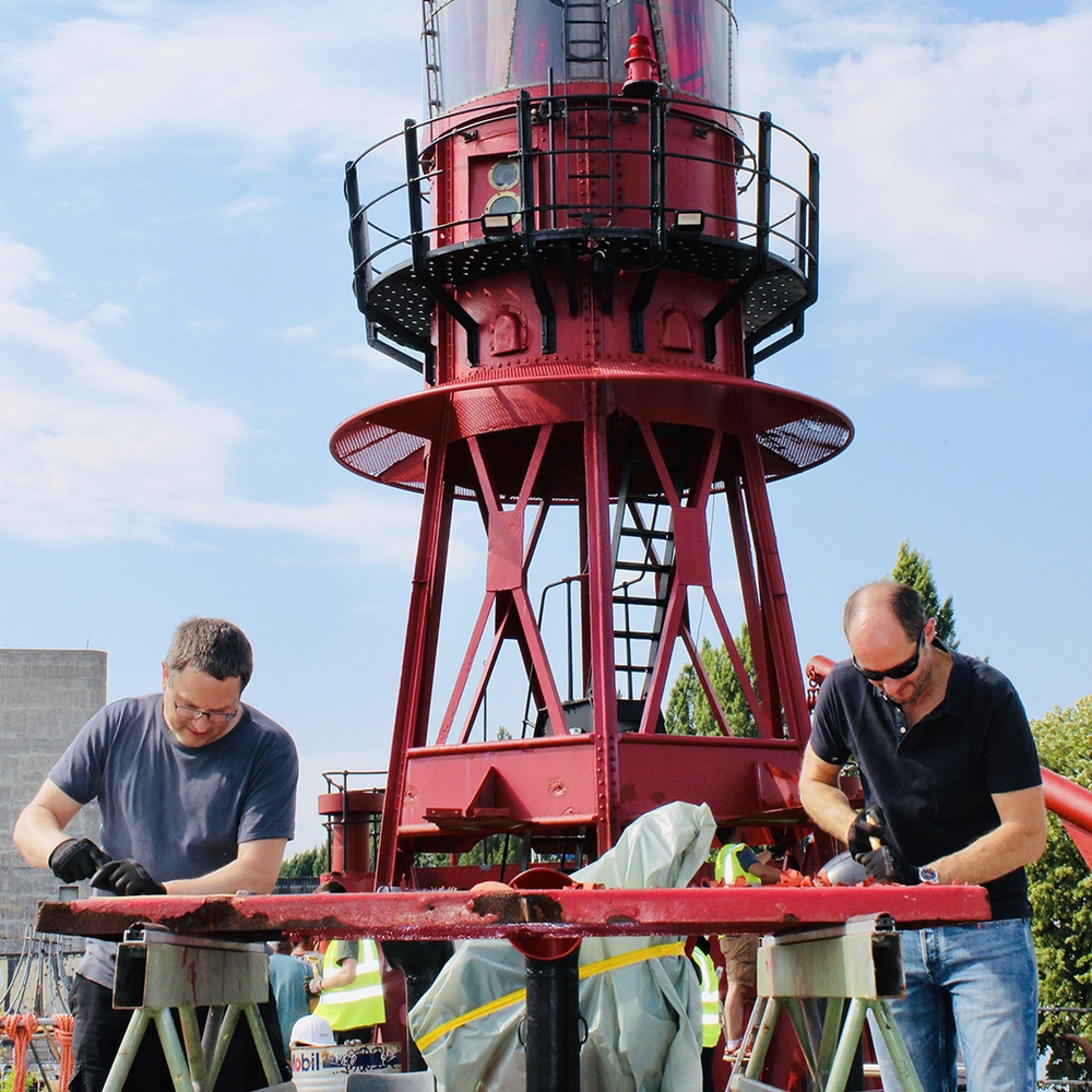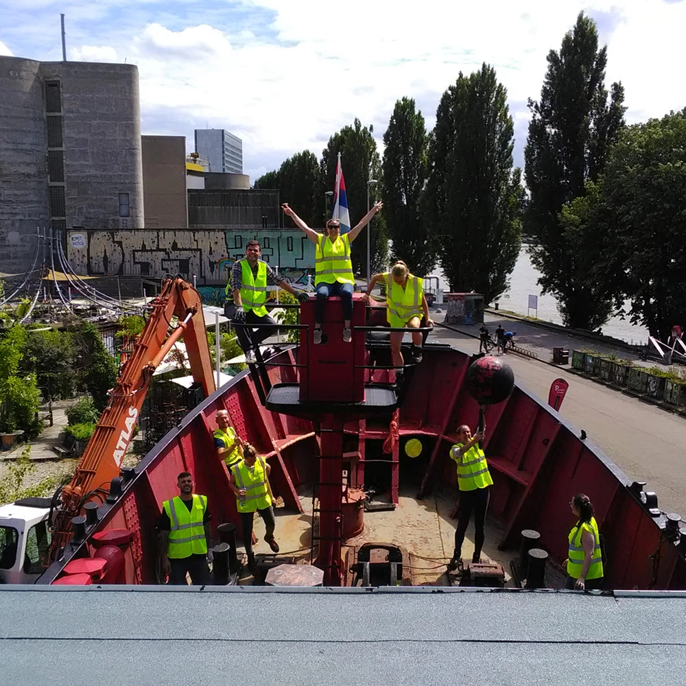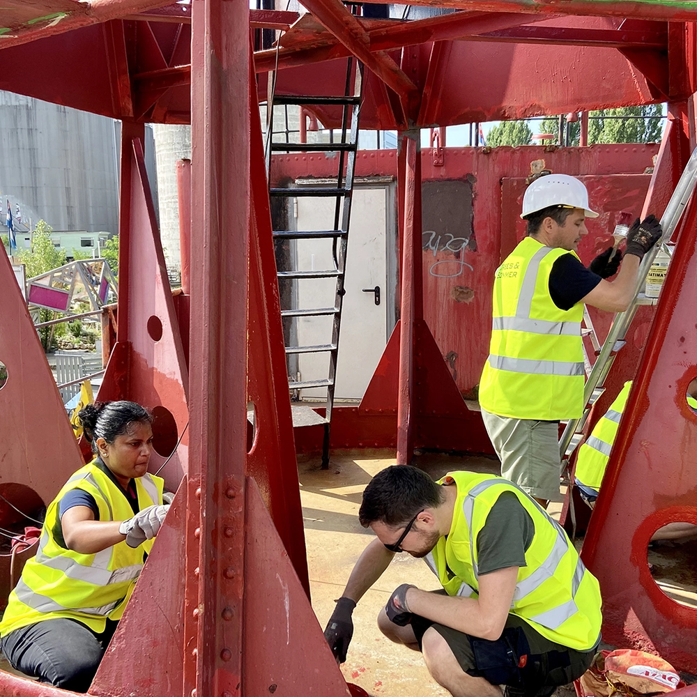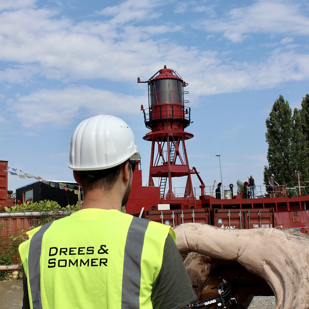 Der Kanton Basel-Stadt und die Schweizerischen Rheinhäfen stellen den Trägervereinen I_Land und Shift Mode Flächen von rund zwei Hektar zur Zwischennutzung zur Verfügung. Rund 25 angegliederten Projekten im Bereich Sport, Kunst, Kultur und Gastronomie kann so eine Plattform für kreative Entfaltung und gewerbliche Ideenentwicklung geboten werden. Die Gannet 1954 ist das Leuchtturmschiff im Holzpark Klybeck – dem vielseitig bespielbaren Kulturraum im Basler Rheinhafen. Bis mindestens Dezember 2024 integriert sich das Schiff, schall- und wärmeisoliert, in den kreativen Freiraum. Neben den vielen kleinen bunten Ateliers und Werkstätten soll das nostalgisches Feuerschiff Raum für Musik, Ausstellungen und Kultur bieten. Hierfür wurde die 1954 erbaute „Gannet“ im August 2019 von Irland in den Hafen nach Basel gebracht und dort ausgewässert. Der Betreiberverein plant die Gannet mit viel Herzblut und Eigeninitiative umzubauen und den Rumpf als Veranstaltungsort nutzbar zu machen. | Bei den Umbauarbeiten packten die Projektmanager von Drees & Sommer tatkräftig an: Mit mehr als 1000 Stunden Planungsleistungen und Arbeitseinsätzen unterstützten die MitarbeiterInnen das Team des Vereins Shift Mode vor Ort. Der herausfordernde Rückbau des 600 Tonnen schweren Feuerschiffs erforderte Einsatz, Ausdauer und Durchhaltevermögen. In mehreren Einsätzen über das Jahr verteilt wurde die Schiffshülle beinahe vollständig ausgehöhlt und bietet künftig als Kultur- und Veranstaltungsort Platz für bis zu 200 Personen. Der Symbolcharakter des Leuchtturms als identitätsstiftendes Objekt für ein ganzes Areal hinterlässt auch bei den Mitarbeitenden einen bleibenden Eindruck. Mit ihrem Einsatz beim Umbau der Gannet konnten sie Themen wie Kreislaufwirtschaft, temporäres Bauen, User Experience und andere innovative Aspekte der nachhaltigen Stadtentwicklung demonstrieren. Gleichzeitig hat das Projektteam einen maßgeblichen Beitrag zur kulturellen Nutzung des Hafenareals geleistet. |