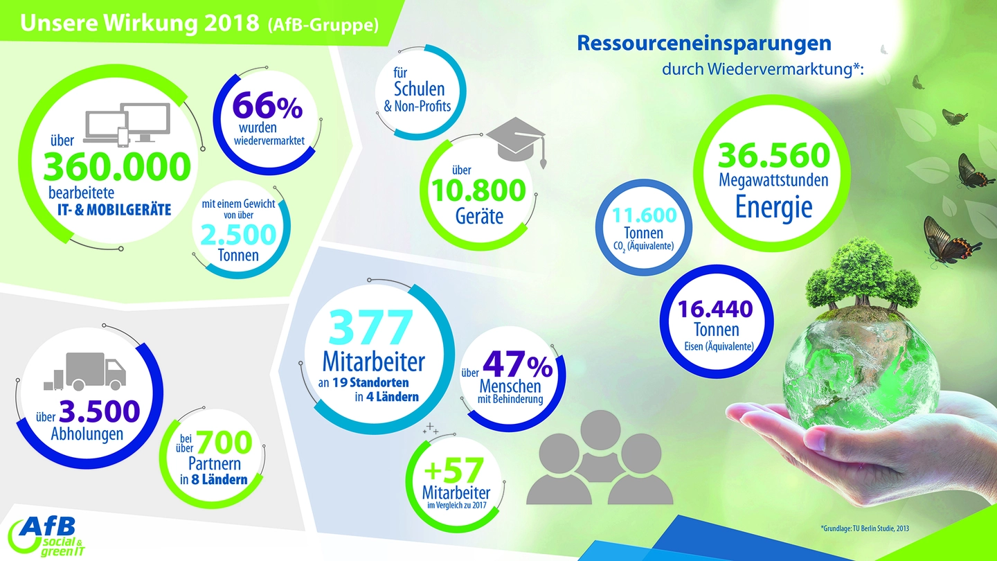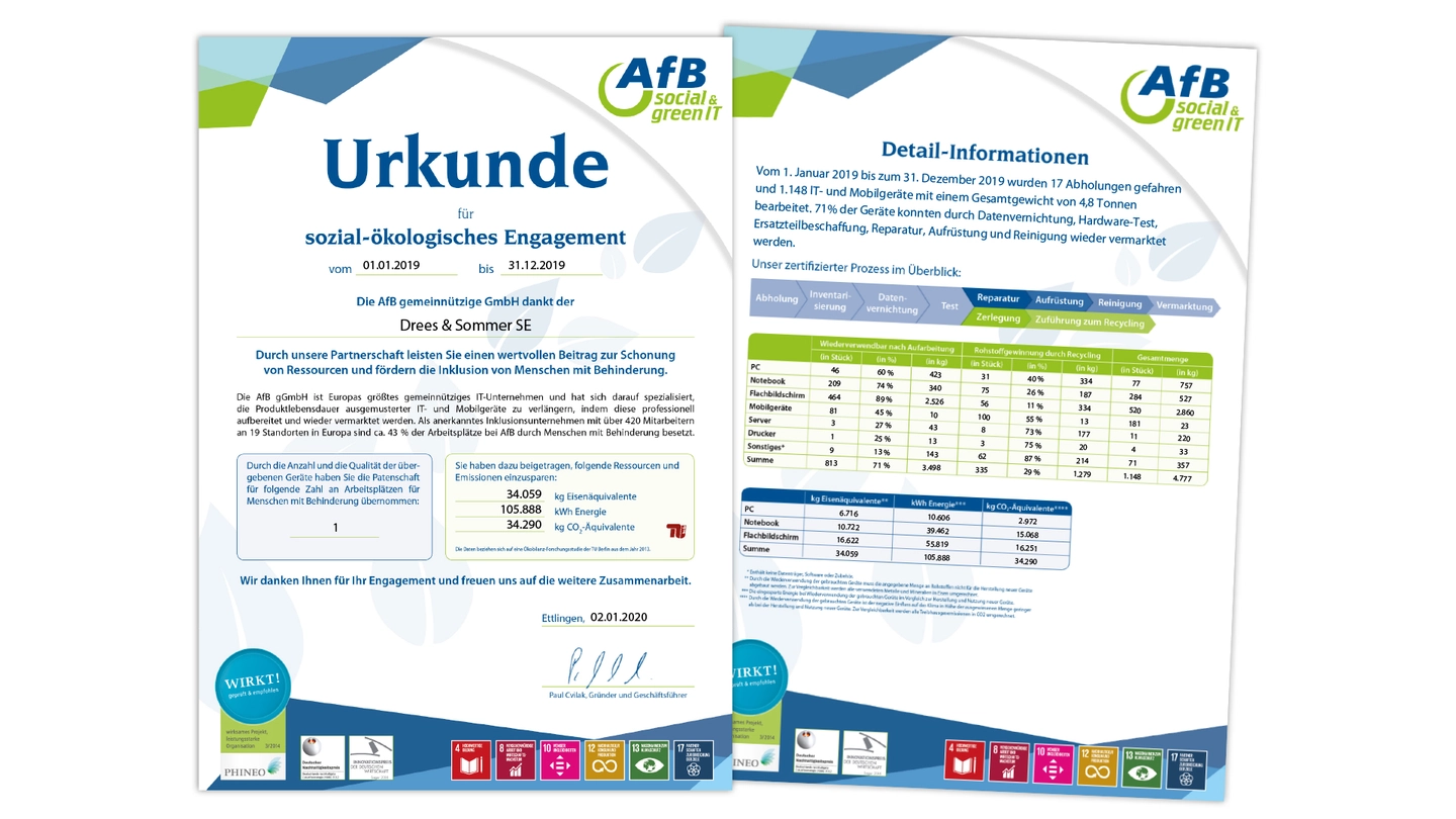 Drees & Sommer arbeitet mit dem Unternehmen AfB (Arbeit für Menschen mit Behinderung) zusammen, das ausgemusterte IT-Geräte wiederverkauft und recycelt. Durch die Zusammenarbeit können wir die Patenschaft für einen Arbeitsplatz für Menschen mit Behinderung übernehmen und machen durch die Hardware-Wiedervermarktung einen wichtigen Schritt in Richtung Nachhaltigkeit.