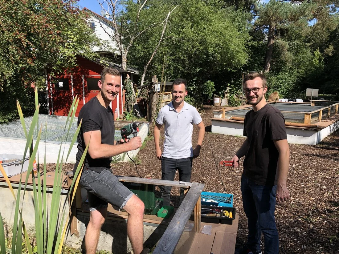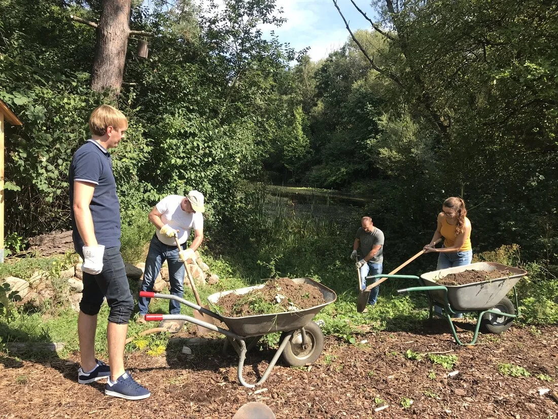 Die Naturschutzgemeinschaft Erlangen e. V., kurz NGE genannt, wurde 1994 von Mitgliedern der Tümpelgruppe gegründet. Seit den 1980er-Jahren setzt sich diese Arbeitsgruppe für den Schutz von Amphibien und ihren Lebensräumen ein. Im Laufe der Jahre hat sich das Aufgabenfeld ständig erweitert. Beispielsweise betreut die NGE heute ökologisch wertvolle Flächen, arbeitet für diese Flächen Konzepte aus und setzt sie in die Tat um. Die engagierten Mitglieder vernetzen Biotope, erstellen Artenhilfskonzepte und führen Artenschutzmaßnahmen für Amphibien durch. Einen Großteil ihrer Zeit widmet die NGE dem "Naturerlebniszentrum Weihergrundstück". Hier können Besucher/innen eine Vielzahl heimischer Lebensräume, Pflanzen und Tiere kennenlernen. Im Rahmen des „Grünen Klassenzimmers“ bietet die NGE Führungen und Veranstaltungen für Kindergärten und Schulen an, bei denen die Kinder auf dem Vereinsgelände in Gehegen und Aquarien einheimische Amphibien und Reptilien erleben können. Das Team vom Drees & Sommer-Standort hat sich entschieden, tatkräftig mitanzupacken. Im September war es endlich soweit: Wolfgang Maisel von Drees & Sommer, der auch erster Vorsitzender der NGE ist, führte seine Kolleginnen und Kollegen zunächst durch das "Naturerlebniszentrum Weihergrundstück". Neben verschiedenen Amphibien wie Gelbbauchunken, Laubfröschen und Feuersalamander entdeckten sie europäische Sumpfschildkröten und konnten sogar einen Eisvogel am Weiher beobachten. Nach dieser Entdeckungstour durch die Natur ging es an die Arbeit: Die Dresos erneuerten an einem Zaun defekte Querriegel, trugen zur Vorbereitung einer geplanten Blumen-Trockenrasen-Wiese den Mutterboden ab, strichen die Fassade der Mauer am Eingang des Grundstücks und montierten den Metallrahmen für die neue Abdeckung des Erdkröten-Geheges. |