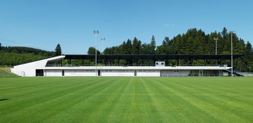 Neubau des Sportzentrums in Straßwalchen mit drei Fußballfeldern, Funktionsgebäude und Wohnung.
