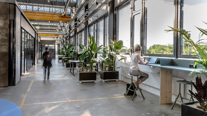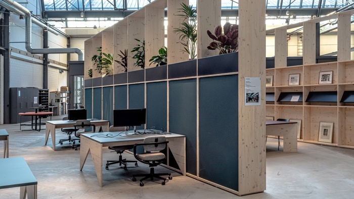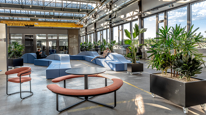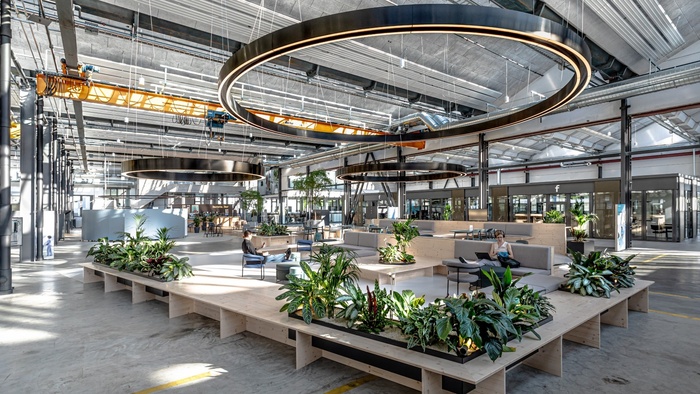 In der Hallenmitte entstand der „Pocketpark“, eine grüne Lunge mit Pflanzen und informellen Sitzgelegenheiten fürs individuelle Arbeiten und für den gegenseitigen Austausch in einer entspannten und gesundheitsfördernden Atmosphäre. Der Marktplatz im Eingangsbereich lockt mit einer Barista Bar. Es gibt einen Open Huddle mit offenen und geschlossenen Kollaborationsflächen und eine Focus Area, die den Prinzipien einer Bibliothek folgt, indem sie konzentriertes Arbeiten ermöglicht. Die Arena im hinteren Teil der Halle bietet mit ihren modularen Möbelsystemen Platz für Brainstorming-Sessions oder – dank ihrer Grösse – für firmenweite Veranstaltungen. Und die Quiet Booth schließlich ist ein Ort für Entspannung und Meditation, zum Beten, Abschalten und Für-sich-Sein.