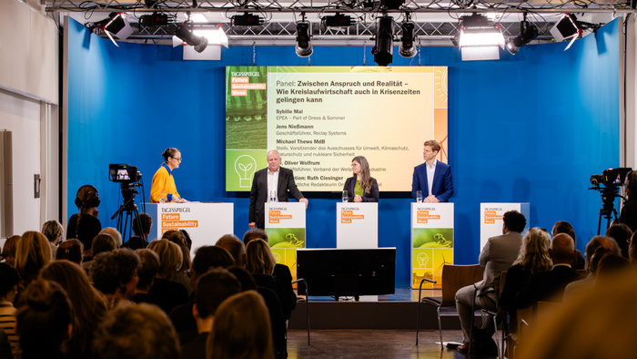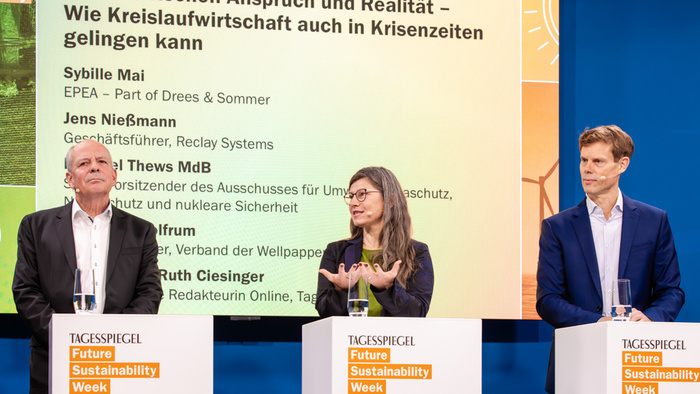 Anfang November vertrat uns unsere Kollegin Sybille Mai, Leading Consultant bei EPEA – Part of Drees & Sommer, erneut auf der Tagesspiegel Future Sustainability Week. Diese widmete sich mit Blick auf die diesjährige UN-Klimakonferenz Lösungsansätzen, Innovationen und Rahmenbedingungen für die nachhaltige Transformation unserer Wirtschaft. Auf einem Panel unter dem Titel „Zwischen Anspruch und Realität - Wie Kreislaufwirtschaft auch in Krisenzeiten gelingen kann“ diskutierte Sybille Mai mit Vertreter:innen aus Wirtschaft und Politik, wie sich ökologische Verantwortung und ökonomische Wettbewerbsfähigkeit miteinander verbinden lassen. Die zentrale Botschaft: Ein entscheidender Baustein für nachhaltiges Wirtschaftswachstum sind eine gesicherte (Sekundär-)Rohstoffverfügbarkeit und die damit verbundenen innovativen grünen Technologien der Kreislaufwirtschaft bzw. Circular Economy. Damit Deutschland weiterhin ein starker Wirtschaftsstandort bleibt, müssen sich technische Innovationen den Risiken aus dem Klimawandel und der Ressourcenverknappung stellen. Antworten darauf bieten zirkuläre Geschäftsmodelle, die ökonomisch nachhaltig und ökologisch nutzbringend sind.
