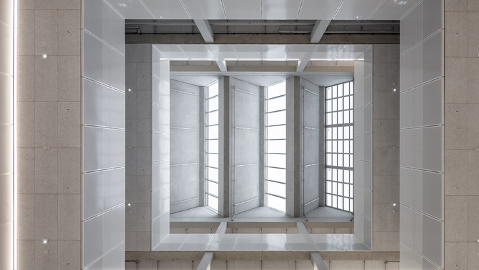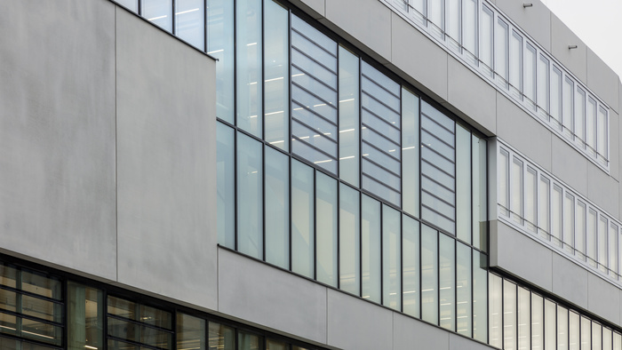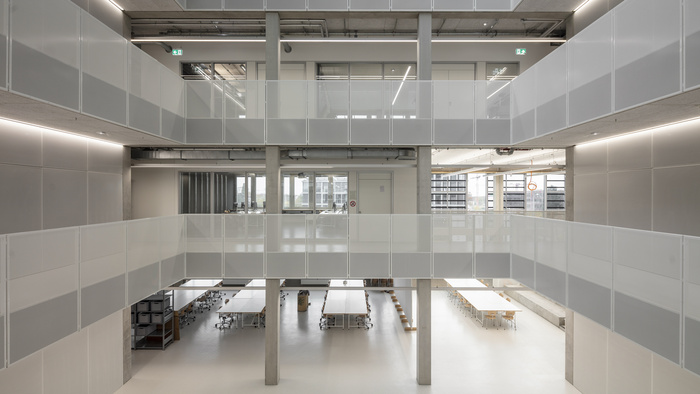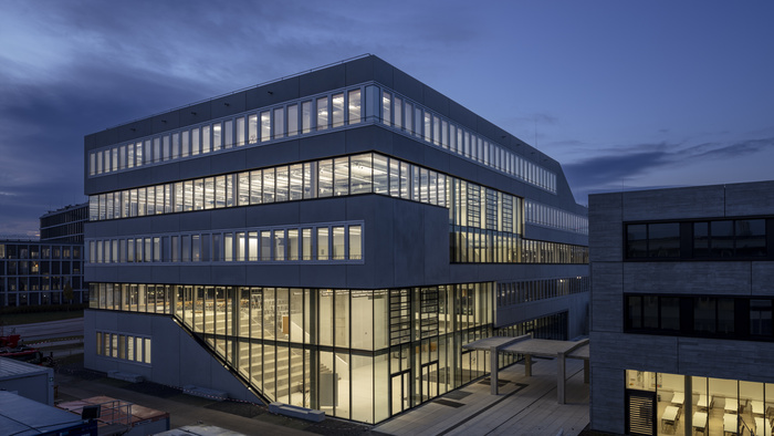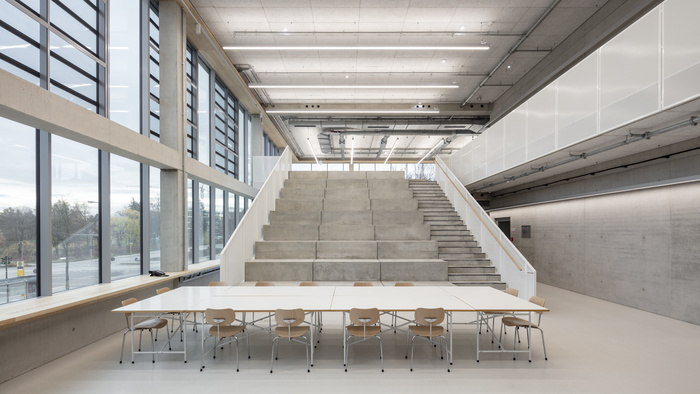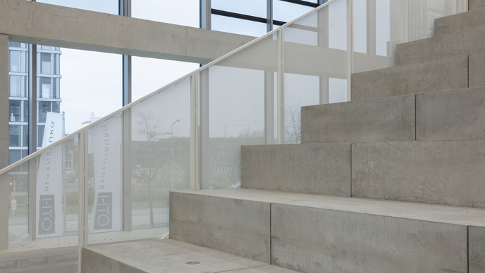 In the six-story new building, the “teaching offices” extend like a lecture hall over several levels up to the roof terrace. This is where students and teachers from the fields of architecture, industrial design, building climate control, and historical building research come together. Exposed concrete walls delimit the open and high-ceilinged rooms. Drees & Sommer, together with Henning Larsen, was responsible for project supervision as well as tendering and contract award services.