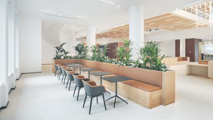 Located in Lorenzer Platz, the heart of the Franconian city, this seven-story building is Sparkasse Nürnberg’s headquarters and is known as the “House of Customers”. The name is due to the institution’s advisory center, which occupies an entire floor of bright, digitized consultation rooms for clients. The building also includes fully automated safe deposit boxes, a co-working area with a coffee bar, and an event space in the basement. This refurbishment not only benefits Sparkasse’s clients, but also their 350 employees, creating a contemporary and pleasant working environment.