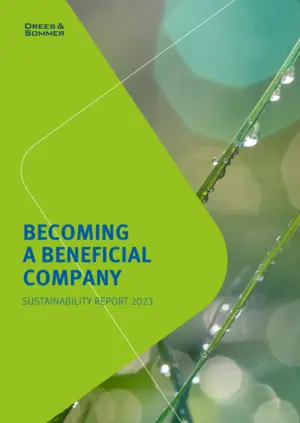 Our strategy is built on a materiality assessment. It identifies nine key activities that must be implemented strategically. In 2024, a new materiality assessment will follow in line with the Corporate Sustainability Reporting Directive (CSRD). It evaluates our impact on the environment, society, and governance – and analyzes external factors that influence our operations. These insights shape our future strategies and help us steer Drees & Sommer toward becoming a Beneficial Company.