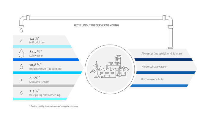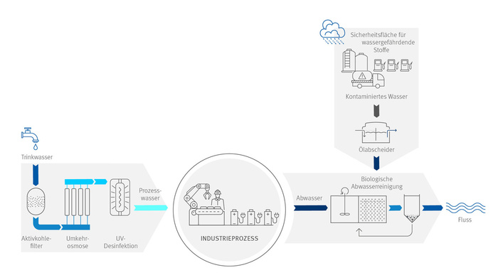 Wasser ist für die industrielle Wertschöpfung eine wichtige Ressource. Unternehmen nutzen das wohl wichtigste Element auf dem blauen Planeten als Brauch- und Prozesswasser für die Produktion oder für Reinigungsschritte, als Kühlwasser für ihre Prozesse oder als Bestandteil von Produkten. Damit in Verbindung stehen Fragen der Abwasserreinigung, aber auch des Niederschlagswasser-Managements sowie des Hochwasserschutzes