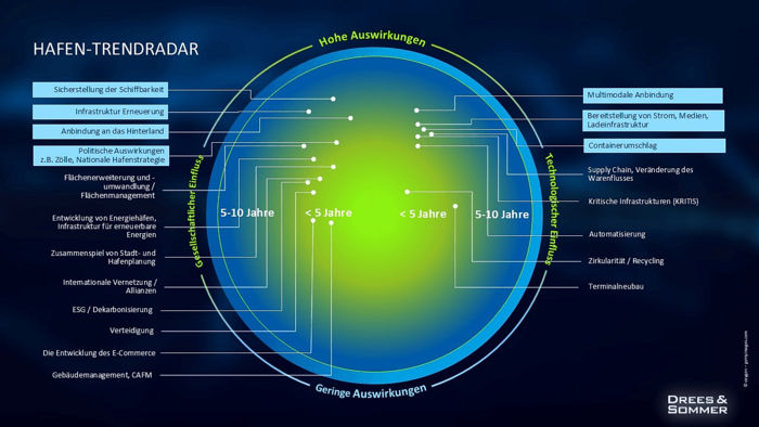 In Zusammenarbeit mit der Logix-Initiative Logistikimmobilie und der duisport - Duisburger Hafen AG hat Drees & Sommer in den vergangenen Monaten eine Trendumfrage zu den Zukunftsthemen von Häfen und deren Nutzern in Europa durchgeführt. Dabei wurden international agierende Häfen und Terminalbetreiber befragt welche Themen sie derzeit am meisten beschäftigen und um eine zeitliche Einordnung der jeweiligen Aspekte gebeten.