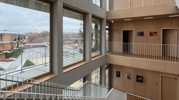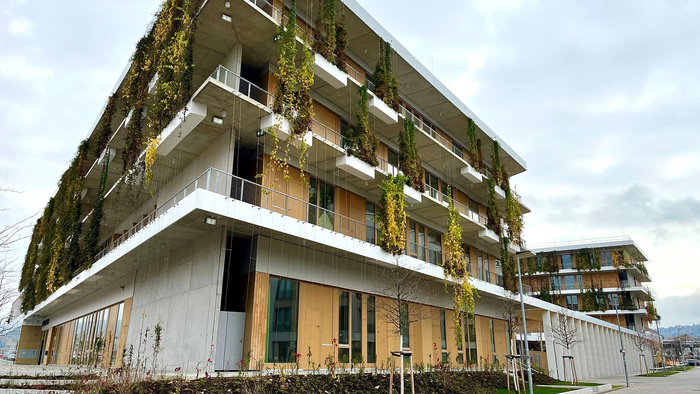 - Nachhaltiges Bauen durch Holz-Hybrid-Bauweise und eine 40 % begrünte Fassadenfläche mit hohem Holzanteil