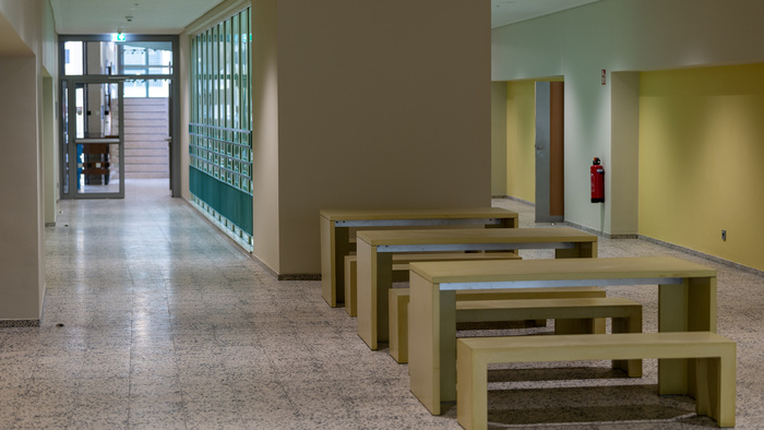 Zwischen kunstvollem Glasbeton, klassischen Putzflächen und einer farbenfrohen Keramikbacksteinfassade tummeln sich die Schüler:innen der Königin-Luise-Schule in Köln. Die denkmalgeschützte Schule besteht aus zwei Trakten. Einen typischen Bau der 1950er-Jahre und die heutige Turnhalle sowie das pädagogische Zentrum aus den 90er-Jahren. Typisch für die Schularchitektur der Jahrhundertmitte sind auch die gegliederte Rasterfassade der Mehrflügelanlage. Die einzigartigen Werke der Architekten Peter Schneider, Oswald Ungers und Georg Meistermann verleihen dem Bestandsgebäude seinen besonderen Vintage-Charme.
