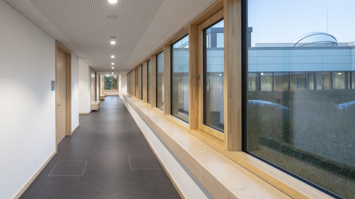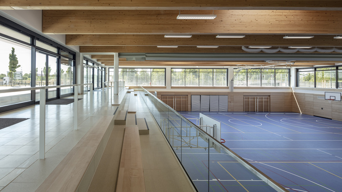 Hier wächst Wissen: Auf einem ehemals freien Gelände befindet sich heute ein lebendiger Lernort für rund 2.000 Schüler:innen. Der neue Schulcampus vereint Grundschule, Gymnasium, Hort, Mensa, Mittagsbetreuung und Vierfachsporthalle unter einem Dach. Die mäandrierende Gebäudestruktur schafft vielfältige Lernbereiche, entspannende Ruhezonen und grüne Innenhöfe. Zentraler Treffpunkt ist die Mensa, die zugleich als Aula und Veranstaltungsraum genutzt werden kann. In einem separaten Baukörper befindet sich die um ein Geschoss in der Erde versenkte Turnhalle. Ihr weit gespanntes Dach tragen 42 Meter lange Holzleimbinder.