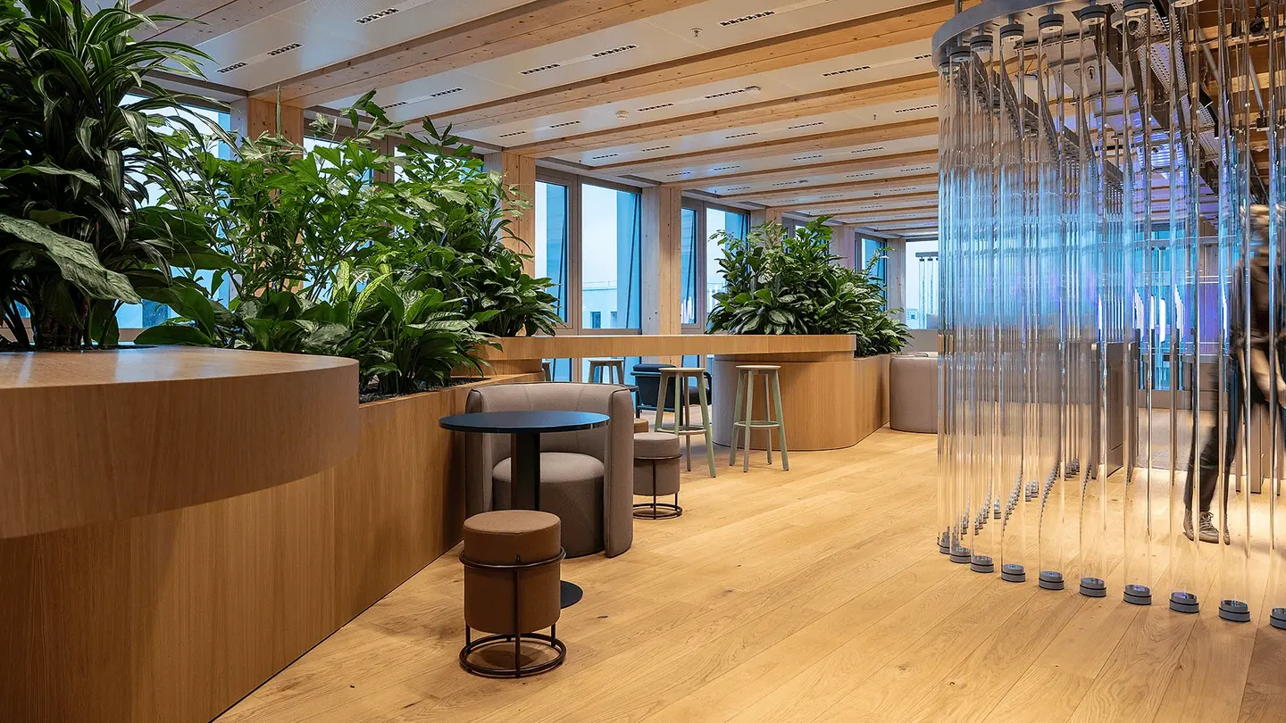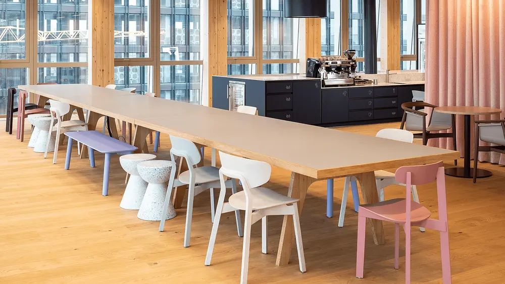 Die Mitarbeitenden setzten den Anspruch, die neue Unternehmenszentrale nachhaltig zu gestalten und gleichzeitig einen Ort der Kreativität und Vielfalt zu schaffen. Während der gesamten Projektdauer trafen sich Kolleg:innen in Workshops – digital und vor Ort. Sie vernetzten sich, erkannten Unterschiede und schätzten diese wert. Das Change Management begleitete den Prozess intensiv. So entstanden Wünsche und eine „New Work Etiquette“ für die gemeinschaftlich genutzten Flächen. Das Ergebnis? Eine Homebase für alle.