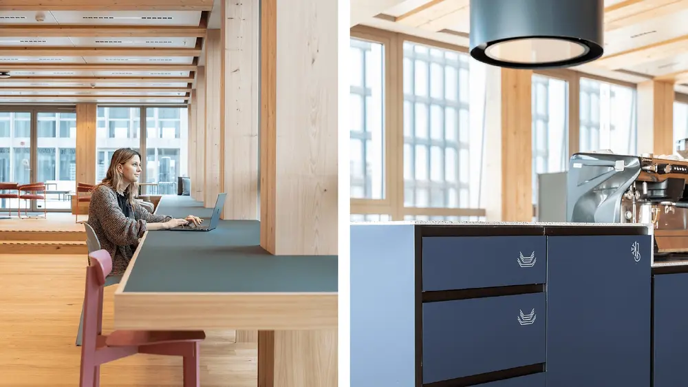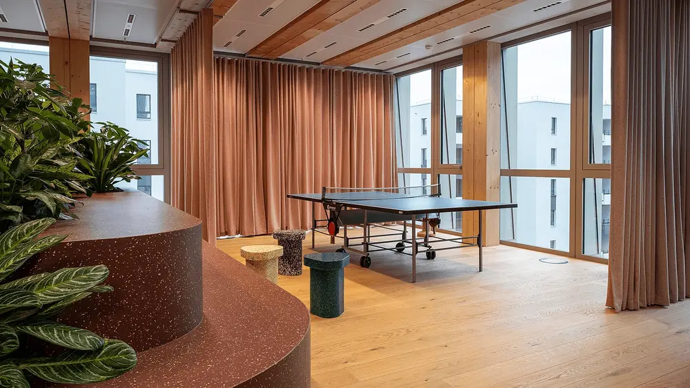 Das derzeit größte Holz-Hybrid-Gebäude Deutschlands bietet auf 5.347 m² Raum für Vernetzung und Austausch. Gleichzeitig schafft es Rückzugsorte und ruhige Arbeitsbereiche. Auf einer Nutzfläche von rund 4.000 m² stehen 128 vollwertige Arbeitsplätze zur Verfügung, ergänzt durch großzügige Erholungsbereiche. Dazu gehören Balkone auf jedem Stockwerk, eine grüne Terrasse und Ruhezonen in den Gemeinschaftsflächen. Meditationsräume, ein Eltern-Kind- und ein Gebetsraum bieten für jede Situation den passenden Rückzugsort.