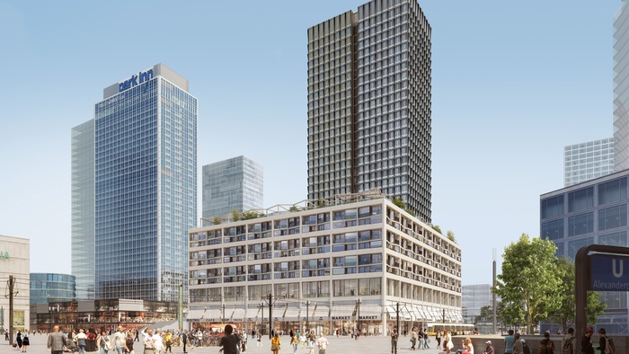 Un immeuble de grande hauteur et un bâtiment de socle offrent de la place pour le travail, l’habitat, le commerce et la restauration. Il y aura également un jardin d’enfants et un étage de club avec une terrasse sur le toit. Il s’agit du premier immeuble de grande hauteur qui sera construit selon le nouveau plan d’aménagement pour la Alexanderplatz. Il s’agira également du premier immeuble de Berlin à utiliser la géothermie. Un réseau de secteur alimentera le nouveau bâtiment en énergie. Les certifications visées, LEED Gold et Wired Score Platinum, confirment l’ambition du projet en termes de durabilité.