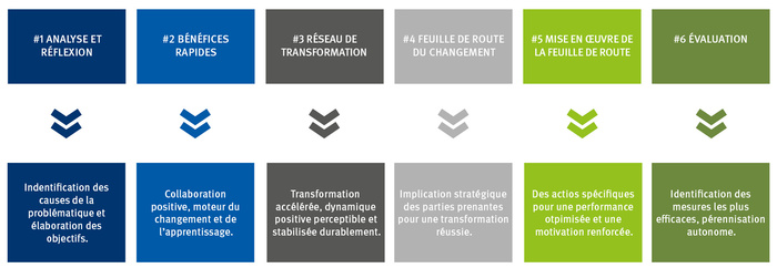 Comme nous avons recours à des compétences et des méthodes diverses, nous sommes en mesure de vous offrir des changements perceptibles sur le spectre entier de la transformation. Nous vous conduisons vers un niveau supérieur de travail et d’organisation.